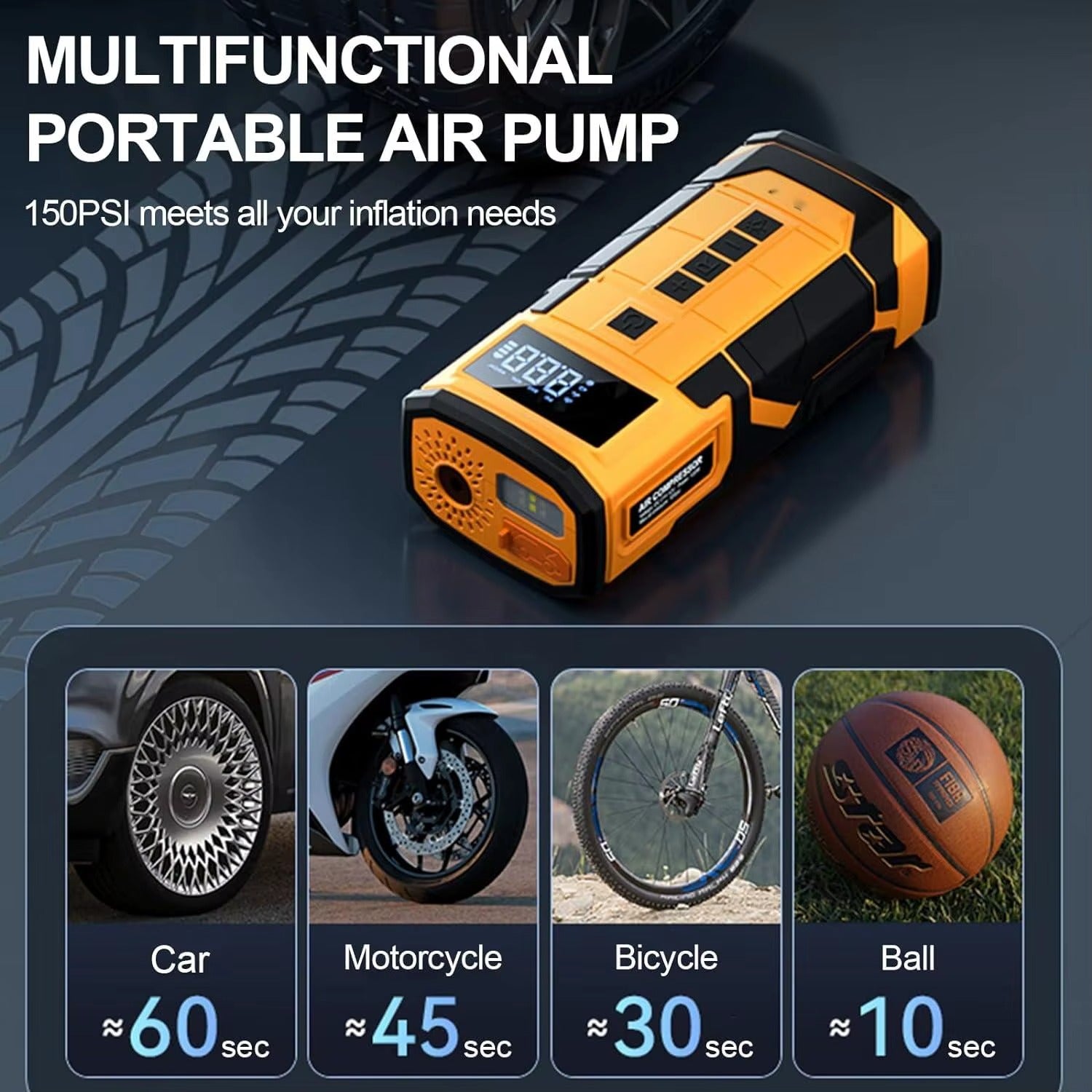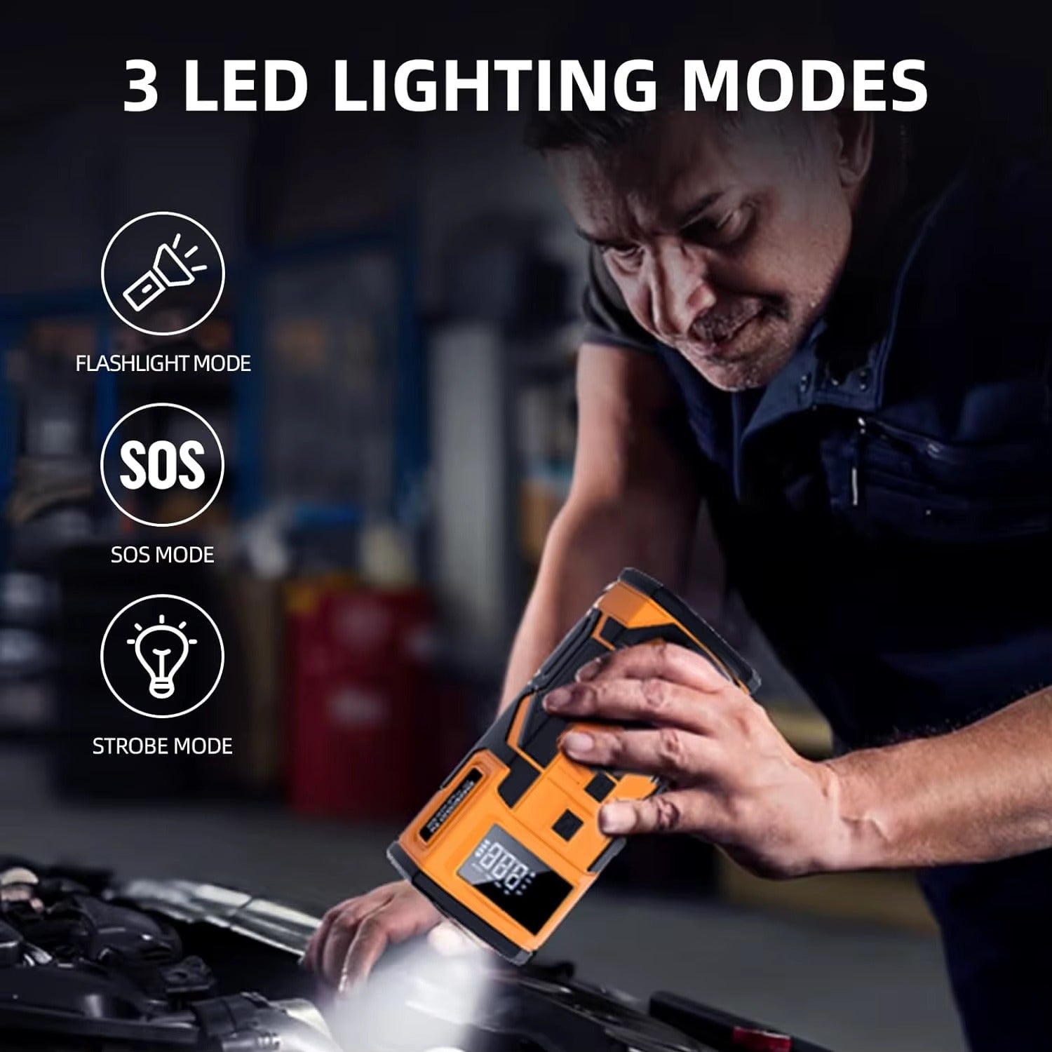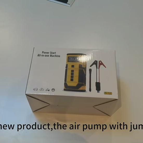 Jump-start function/ Reverse connection protection jump-start clips/22mm Piston/ 2000 mAh*4/ Fast inflation / 4 inflation modes/ Customizable pressure/ 3 lighting modes/ Power bank