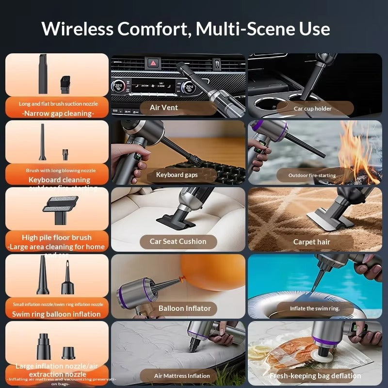 17000pa / 80000rpm /2000 mAh*3/ Brushless motor/ Blower function / 8 nozzles / Washable filter/ Quick-opening dust collection bin